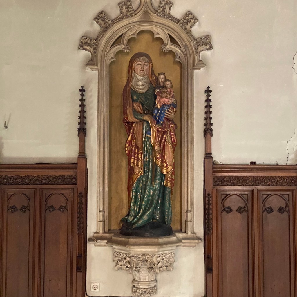 Het beeld toont Sint-Anna met haar dochter Maria als kind, die op haar beurt de kleine Jezus draagt. Deze voorstelling, bekend als ‘Anna-ten-Drieën’, is zeldzaam en bijzonder intrigerend. Let vooral op de druiventros die Jezus in zijn hand houdt.